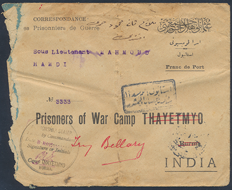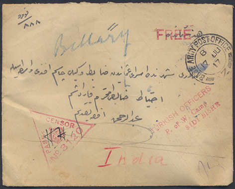 During the First World War, some 12,000 Turkish soldiers were taken prisoner in the Sinai, Palestine and Mesopotamian campaigns and transferred to camps in India and Burma. Like POWs in other theatres, they were able to send and receive mail in the camps.