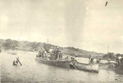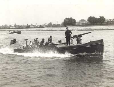 The first encounter with the enemy took place on December 26th. At 9 a.m. the German gunboat Kingani, a vessel of 30 or 40 tons armed with one gun was sighted about seven miles distant from Lukuga steaming south, and the Mimi and the Toutou immediately set out to attack her. The enemy having no gun aft, the Mimi attacked her from astern, and, having got the range, opened fire with a high explosive shell from her 3-pounder Hotchkiss. The first shell struck the Kingani’s gun-shield, killing the two men at the gun and the captain. After a few more shots the remainder of the crew surrendered, and the Kingani was taken into harbour in a sinking condition. She was soon repaired. A 12-pounder gun was mounted on her, and, as H.M.S. Fifi, she proved a valuable addition to the British flotilla.