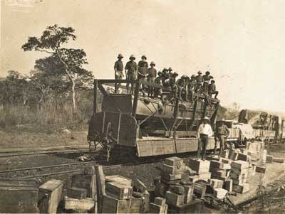 Notwithstanding the precautions that were taken to keep the expedition a secret, it is difficult to believe that the enemy received no warning of its dispatch. They probably heard of it, but refused to take it seriously. Certainly it must have seemed to them, at first sight, a harebrained enterprise. After being landed, at Cape Town the boats had to be taken 2,300 miles by train, via Bulawayo and Livingstone, to the railhead north of Elizabethville in the Belgian Congo. Next there followed 150 miles of haulage, over atrocious roads, across country varying in altitude from 2,000 to 6,000 feet. This was followed by another journey on trucks over a short section of railway. Then the boats were floated 400 miles down the Lualaba River under their own power for part of the journey, and for the rest on lighters. Shoals and rocks abounded, and barrels had to be lashed under the boats to reduce their draught. The final stage of the journey was by rail again to the small Belgian harbour of Lukuga, about half way up the western shore of the Lake.