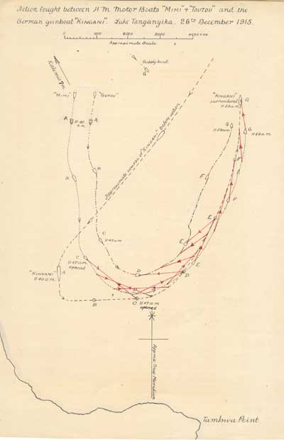 In April 1915, a scheme was approved by the Admiralty for depriving the Germans of the command which they had hitherto held, by means of three small armed vessels, on Lake Tanganyika. The plan was to send out from England to Cape Town, and thence by rail, road and river to the Lake, two motor boats of a speed and armament which would outclass those of the German vessels. The two boats, with a small Expeditionary Force under the command of Commander G. Spicer Simson, R.N., arrived at Cape Town towards the end of June. By December 23rd the “Mimi” and the “Toutou”, as the boats were named, had been successfully launched on the Lake, and three days later the first action was fought.