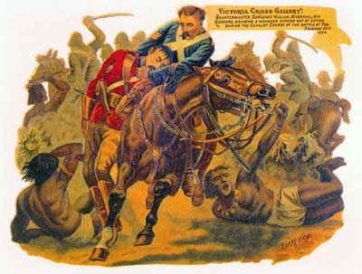 Quartermaster-Sergeant Marshall was awarded the Victoria Cross, “For his conspicuous bravery during the Cavalry charge at El-Teb, on 29th February last, in bringing Lieutenant-Colonel Barrow, 19th Hussars, out of action. That officer having been severely wounded, and his horse killed, was on the ground surrounded by the enemy, when Quartermaster-Sergeant Marshall, who stayed behind with him, seized his hand and dragged him through the enemy back to the regiment. Had Lieutenant-Colonel Barrow been left behind he must have been killed.”