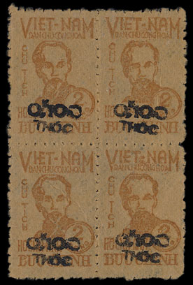 Lot 621 in our upcoming stamp auction features one of Vietnam’s most culturally important postage stamps – the 1946 Ho Chi Minh portrait design. The significance of this design is in its innovation, being the first original stamp design produced by the Viet-Minh. The miniature full face renditions of the Vietnamese leader were printed on thin hand-made ‘gio’ paper and while the material itself was delicate the strength of the design could not be questioned.