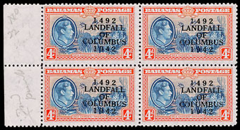 This is followed by a substantial Bahamas section in 80 lots which features items from the Len Mason collection. Included are pre-stamp covers, Queen Victoria Chalon Heads in spectacular and rarely seen blocks, as well as King George VI specialised collections and items. There is a particularly fine study of the 1942 Landfall issue, and much else.