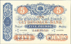 Individually lotted notes also achieved above estimate results. This Clydesdale Bank 1946 £5, graded as \'extremely fine\', and with a low serial number, sold for £401.