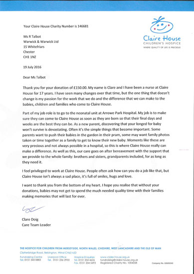 Claire’s House Children’s Hospice provides care and support to families with children that have life threatening or life limiting conditions. The charity depends on the support of donations and Warwick & Warwick are proud to help. Claire’s House can be found here.