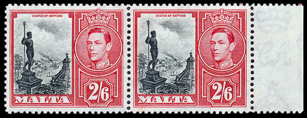 A Malta 2/6d pair, one showing the ‘damaged value tablet’ variety. This variety is rarely offered and the catalogue price may not reflect its scarcity, so it could be one to tuck away for the future.