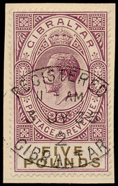 A Gibraltar 1925-32 £5 on a small piece sold for £2,240.