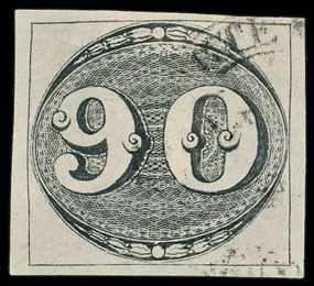 Brazil was the second country to issue postage stamps that could be used throughout the nation, with the ‘Bull’s Eye’ 30r & 60r stamps of August 1843, plus a 90r that was reserved for international mail. They employed the same company that printed the Penny Black but issued them in much smaller quantities and, as a result, very good examples are rarely seen, so this outstanding 90r, with 4 good margins undoubtedly helped a Brazil collection in 3 albums reach a price of £1,150.