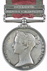 Lot 14a, 1793-1814 MGSM 2 clasps Sahagun and Benevente, Toulouse to Francis Davis 18th Light Dragoons was 1 of only 6 medals issued to the regiment with this clasp combination. His service record shows he served in Rutland Fencible Cavalry 10/6/1794 to 21/3/1800, enlisted 22/3/1800 in 18th Light Dragoons which in 1807 became 18th Hussars, discharged 20/9/14 aged 40 in consequence of being nearly worn out. This single medal sold for £1888.