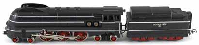 Moving on to the OO/HO gauge section, modern locomotives were popular with bidders. This Marklin 3-rail SK800 4-6-4 Streamlined locomotive and tender realised £377 including buyers\' premium.
