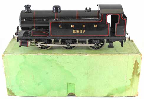 The Bassett-Lowke brand was ever popular. This 12v electric Standard Tank locomotive 0-6-0 LNER 8937, in black with red lining, no. 5305/0, described as \'excellent\', sold for £283.