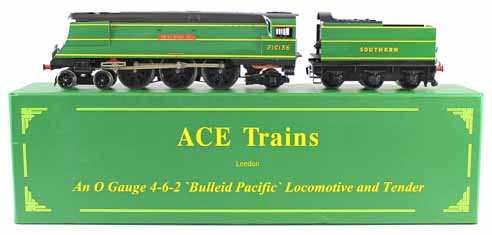 This Southern Rail malachite green 21C136 ‘Westward Ho’ Bullied Pacific Class 4-6-2 locomotive and tender No. E/9 achieved £507 including buyers\' premium.