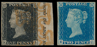 Also from the Line Engraved issues, a 1d black plate 11, right side marginal, with part inscription. The stamp has a neat red Maltese Cross cancel. An 1840 2d pale blue plate 1 with original gum & accompanying Brandon certificate.