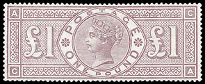 An 1884 £1, watermark crowns, described as ‘o.g. with some imperfections’ and with a catalogue price of £32,000 could be the pinnacle of most GB collections.