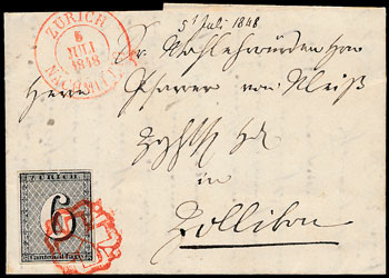 A Switzerland 1848 entire addressed to Zolliken is estimated at £1,200.