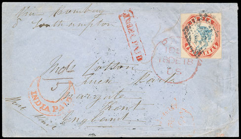 Rarely offered, this very attractive 1857 India cover to England is estimated at £750.