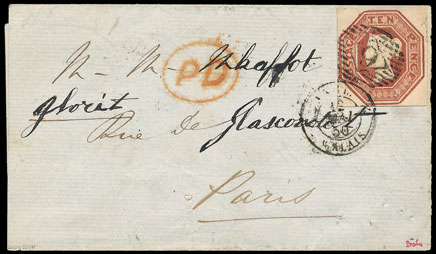 An 1847-54 embossed 10d on a part entire to Paris is estimated at a conservative £350.