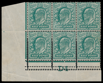 A King Edward VII ½d in corner marginal block of 6 and suffering repeated attention from the perforator resulting in a ‘spectacular’ error, promoted a minor value to a very interesting item. The block sold for £204.