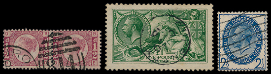 Also in the GB section an 1870 ½d plate 9 pair with, clear plate No’s sold for £372. A 1913 Waterlow Seahorse £1 with Guernsey ‘thimble’ cancel achieved £530 and a 1929 PUC 2½d inverted watermark reached £288.
