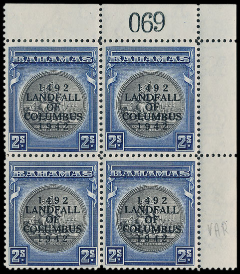The auction included remaining items from the Len Mason Bahamas 1942 Landfall collection. Amongst these a 2s marginal block of 4, the bottom right stamp with variety ‘stop after Columbus’ sold for £3070.