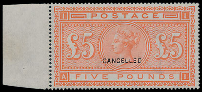 A superb 1867-83 £5 Anchor watermark, with ‘CANCELLED’ overprint, sold for £2,600.