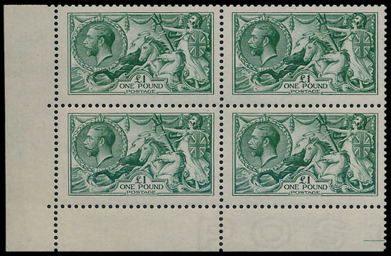 A 1913 Waterlow Seahorse £1 corner marginal block of 4 sold for £7,670.