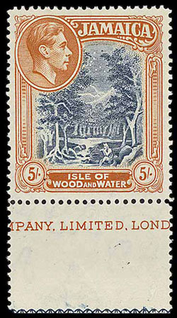 Choice items from the British Commonwealth lots were popular with a superb Jamaica KGVI 5/- line perf 14 M selling for £2,600.