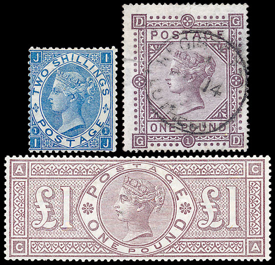 Similarly with Surface Printed, a 1867-80 2/- deep blue sold for £740. 1867-73 £1 watermark Cross sold for £825 and 1884 £1 watermark Crowns sold for £4,950.