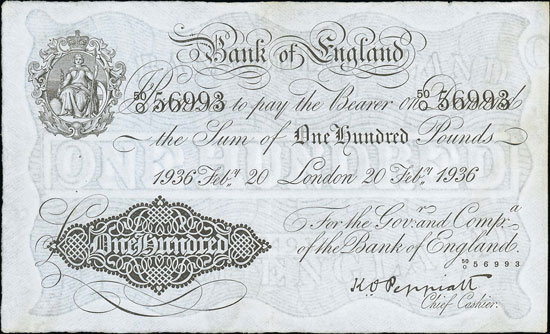 Staying with Peppiatt, this lovely 1936 £100, graded as nearly very fine, achieved £649.