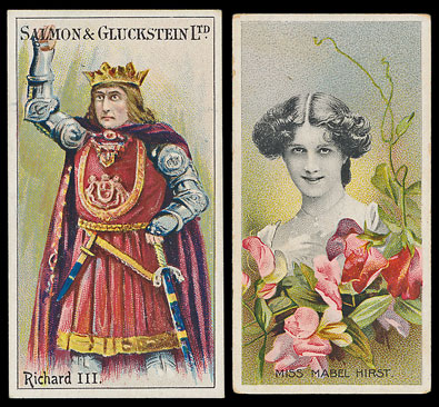 There was a strong section of individual British sets and many achieved excellent results. Some of the most notable include a Phillips large part set of Footballers KF estimated at £600 realising over £1500, a Salmon & Gluckstein Shakespearian Series (Frame On Back) set estimated £100 made £260 despite 1 being trimmed and another with a crease. The Taddy sets did very well with the highlights being a set of Actresses with Flowers part set of 17 cards realising £306 despite 3 with faults, a Royalty Series set made over £280 against an estimate of £150 and an Orders of Chivlary set with an estimate of £100 realising £236 despite several having some toning. A Wills 1908 Cricketers (WILL’S) set estimated at £80 and made £165 and a Wix Kensitas Flowers Second Series L set estimated £150 made £200.