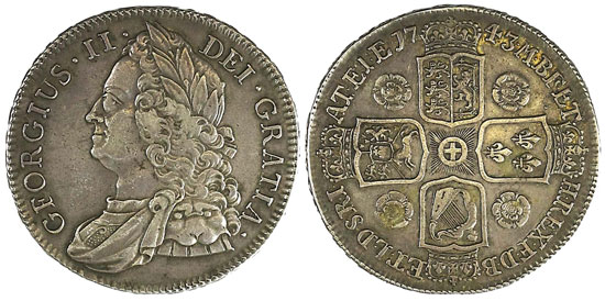 This 1743 crown, graded as very fine/ good very fine, realised £649.