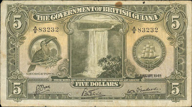 In the world banknotes section this British Guiana 1942 $5 sold for three times estimate at £507!