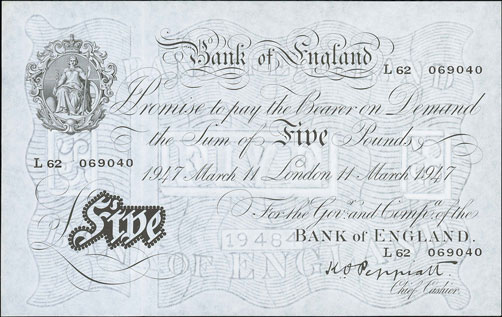 This Peppiatt 1947 (11 Mar) £5, graded as extremely fine, sold for £240.