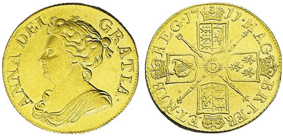 This 1711 guinea, third head, graded as good extremely fine/ about uncirculated, sold for £5,280.