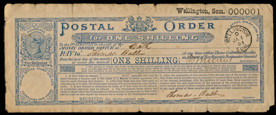 This rare one shilling postal order dated 1st January 1881 from the Wellington post office in Somerset and numbered No. 000001 sold for £2,065. This was the first ever postal order issued from this post office and the lucky buyer of this lot now owns an interesting piece of postal history. For the full story please see our Latest News page.