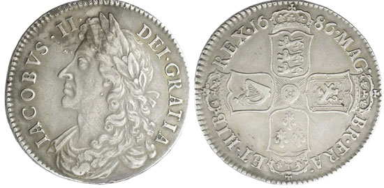 On to the British milled coin section and this James I 1686 half crown, described as nearly extremely fine, realised £944.