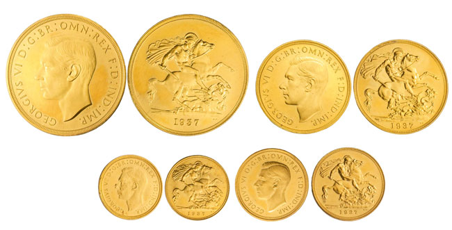 And this 1937 £5, £2 sovereign and half sovereign 4 coin gold set realised £9,440.