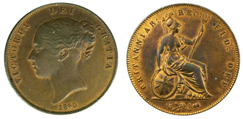 This unusual 1860/59 penny, graded as nearly extremely fine, a large part with lustre, achieved a massive £3,480!