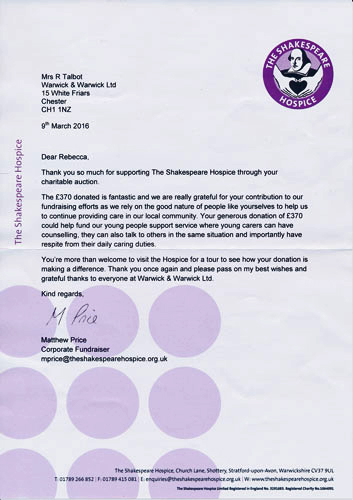 Click here if you would like to read the account of the previous charitable donation which we were able to make. Click here for a link to the Shakespeare Hospice website.