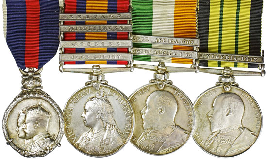 Lot 69 was a scarce group to Lieutenant Charles Lionel Wells, Northern Nigeria Regiment, who was mentioned in dispatches during a Victoria Cross action in a minor campaign in 1903, in Northern Nigeria. His group of 4 medals sold for £3,304.