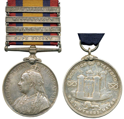 Tribute medals are becoming ever more popular and lot 67 was such a lot including a Boer War Stafford silver tribute medal to Private Horace Simpkin. The lot also included the rare scroll presenting the Freedom of the Borough to the medal recipient which drove the hammer price well past estimate with a room bidder winning the lot for £1416.