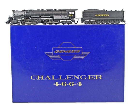 In the OO gauge section this Athearn (Genesis) Clinchfield black 670 Challenger Class 4-6-6-4 locomotive and 12 wheel tender no. G9124 realised £216.