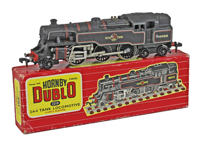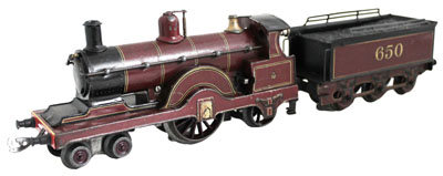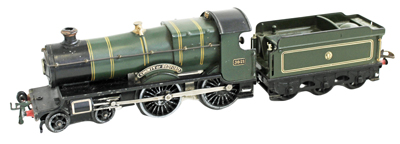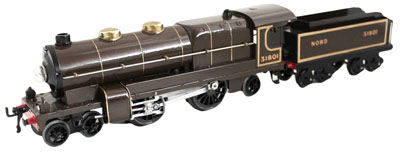 O gauge models proved popular as ever with this Bing clockwork MR maroon 650 4-4-2 locomotive and tender selling for £490 and this Hornby 20V GWR green 3821 'County of Bedford' 4-4-0 locomotive the tender achieved £320. This Hornby 3-rail electric Nord brown 31801 4-4-2 locomotive and tender sold for £140.