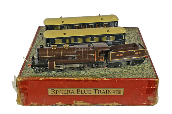 This Hornby No. 2 Pullman set with C/W LNER green 2711 4-4-0 locomotive and tender sold for £216 and this Riviera Blue Train set achieved £480.