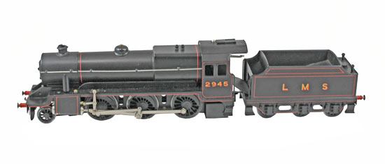 This Aster Hobby (Japan) gauge 1 30th anniversary BR ‘Winston Churchill’ 4-6-2 locomotive and tender sold for £588 and this Bassett-Lowke O gauge professionally re-painted LMS black 2945 Stanier Mogul 2-6-0 locomotive and tender achieved £240.