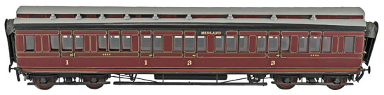 A lovely selection of O gauge Lawrence Models were offered in this auction. Highlights include this pair of Midland maroon 8 wheel coaches with 2093 3rd/Brake and 3086 1st/3rd which achieved £619.