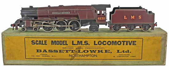 This older Bassett-Lowke LMS ‘Princess Coronation’ Class 4-6-2 LMS 6232 ‘Duchess of Montrose’ No. 5613/0 maroon 12volt DC 3-rail locomotive and tender realised £1,062.