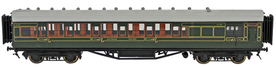 This Lawrence Scale Models professional Kit built and painted rake of 4 coaches realised £554.