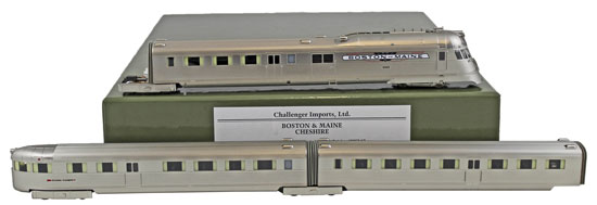 In the OO/ HO gauge section this Challenger Imports Ltd (Korea) Boston and Maine 6000 Cheshire Flying Yankee locomotive and two coaches No. #2357.1S sold for £600.