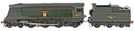 And this Scratch/ Kit built electric BR green 34107 ‘Blandford Forum’ Streamlined West Country Class 4-6-2 locomotive and tender realised £600.